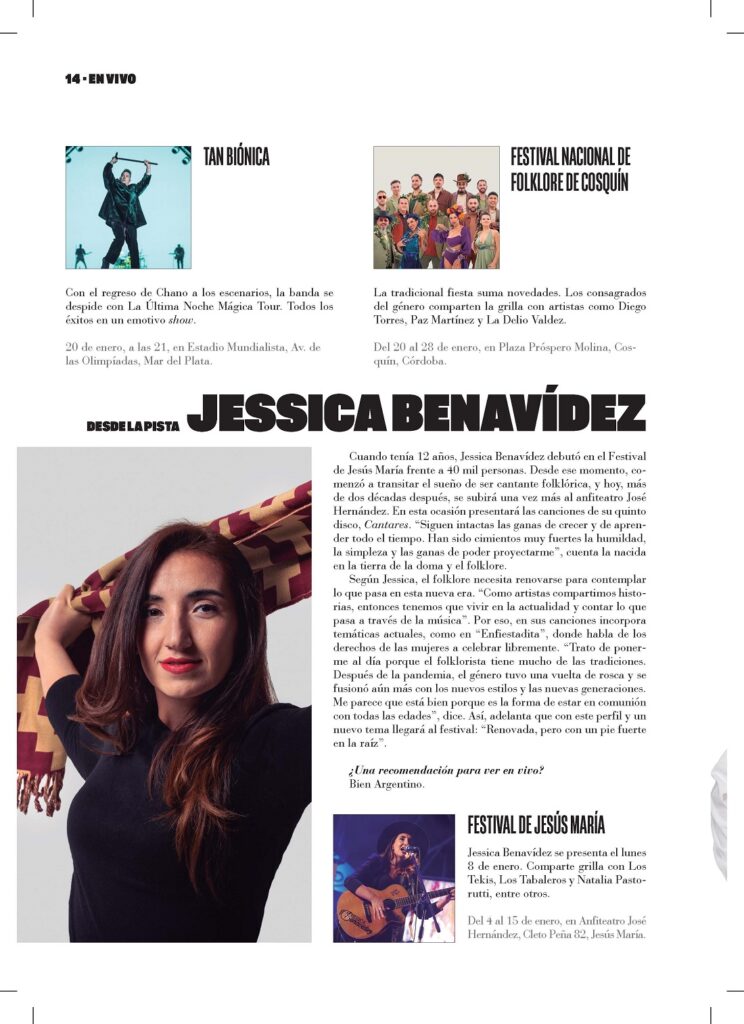 Cuando tenía 12 años, Jessica Benavídez debutó en el Festival de Jesús María frente a 40 mil personas. Desde ese momento, comenzó a transitar el sueño de ser cantante folklórica, y hoy, más de dos décadas después, se subirá una vez más al anfiteatro José Hernández. En esta ocasión presentará las canciones de su quinto disco, Cantares. “Siguen intactas las ganas de crecer y de aprender todo el tiempo. Han sido cimientos muy fuertes la humildad, la simpleza y las ganas de poder proyectarme”, cuenta la nacida en la tierra de la doma y el folklore.