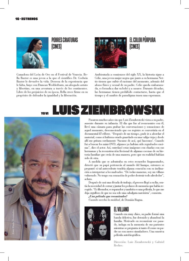 Pasaron muchos años sin que Luis Ziembrowski viera a su padre, ausente durante su infancia. El día que fue al reencuentro con él, llevó una cámara para grabar las conversaciones y sensaciones de aquel momento, desconociendo que ese registro se convertiría en el documental El villano. “Después de un tiempo, pude ir a abordar el material, como si hubiera estado guardado en una valija vieja y desde allí me gritara sordamente ‘Sacame de acá, qué hacemos’. Cuando fui a buscar los mini-DVD, algunos ya habían sido regrabados encima”, dice el actor. Así, entrelazó estas imágenes con charlas con sus hermanas y la reconstrucción ficcional de algunas escenas de su historia familiar que creía de una manera, pero que en realidad habían sido de otra.