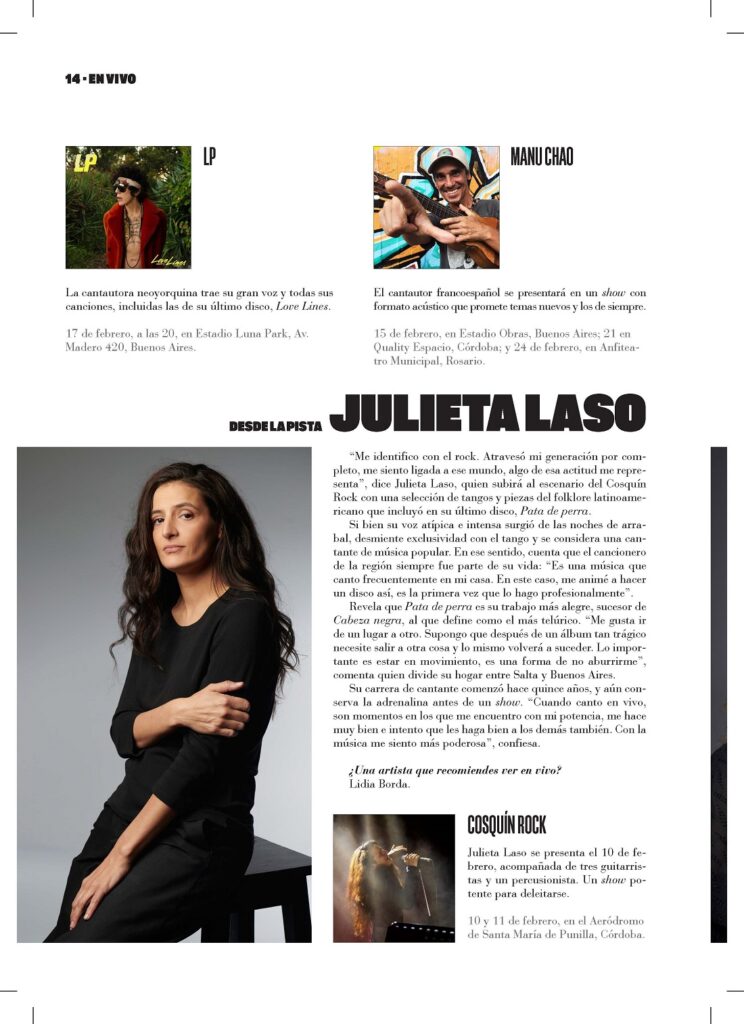“Me identifico con el rock. Atravesó mi generación por completo, me siento ligada a ese mundo, algo de esa actitud me representa”, dice Julieta Laso, quien subirá al escenario del Cosquín Rock con una selección de tangos y piezas del folklore latinoamericano que incluyó en su último disco, Pata de perra.