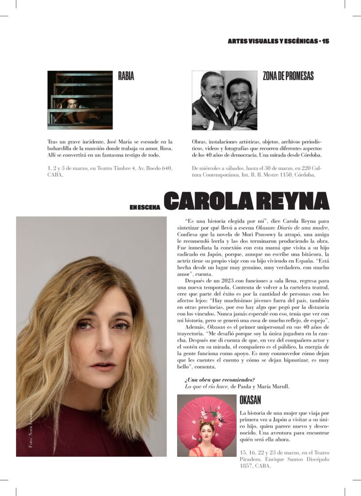 “Es una historia elegida por mí”, dice Carola Reyna para sintetizar por qué llevó a escena Okasan: Diario de una madre. Confiesa que la novela de Mori Ponsowy la atrapó, una amiga le recomendó leerla y las dos terminaron produciendo la obra. Fue inmediata la conexión con esta mamá que visita a su hijo radicado en Japón, porque, aunque no escribe una bitácora, la actriz tiene su propio viaje con su hijo viviendo en España. “Está hecha desde un lugar muy genuino, muy verdadero, con mucho amor”, cuenta.