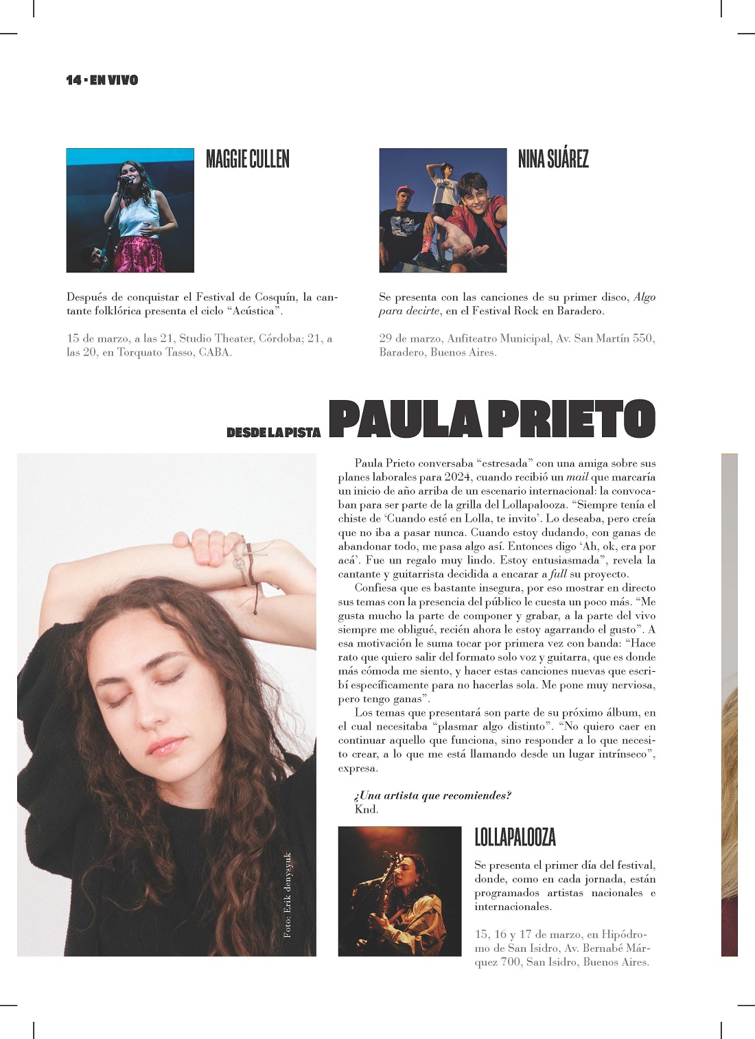 Paula Prieto conversaba “estresada” con una amiga sobre sus planes laborales para 2024, cuando recibió un mail que marcaría un inicio de año arriba de un escenario internacional: la convocaban para ser parte de la grilla del Lollapalooza. “Siempre tenía el chiste de ‘Cuando esté en Lolla, te invito’. Lo deseaba, pero creía que no iba a pasar nunca. Cuando estoy dudando, con ganas de abandonar todo, me pasa algo así. Entonces digo ‘Ah, ok, era por acá’. Fue un regalo muy lindo. Estoy entusiasmada”, revela la cantante y guitarrista decidida a encarar a full su proyecto.