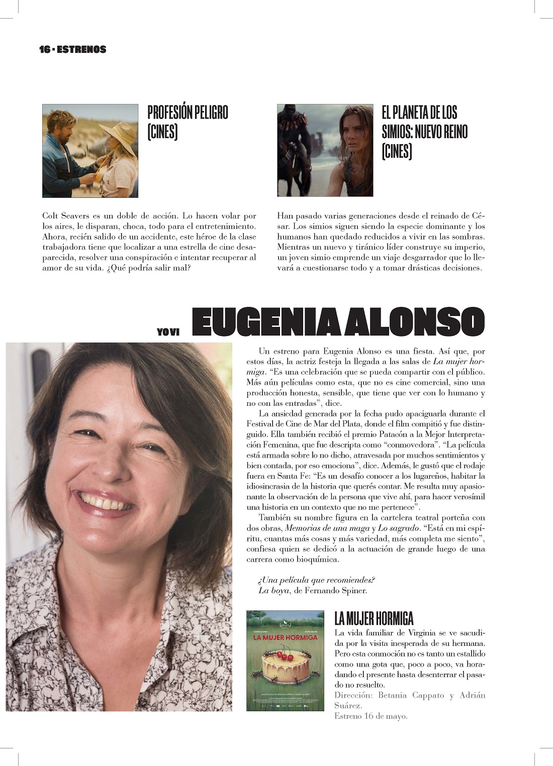 Un estreno para Eugenia Alonso es una fiesta. Así que, por estos días, la actriz festeja la llegada a las salas de La mujer hormiga. “Es una celebración que se pueda compartir con el público. Más aún películas como esta, que no es cine comercial, sino una producción honesta, sensible, que tiene que ver con lo humano y no con las entradas”, dice.