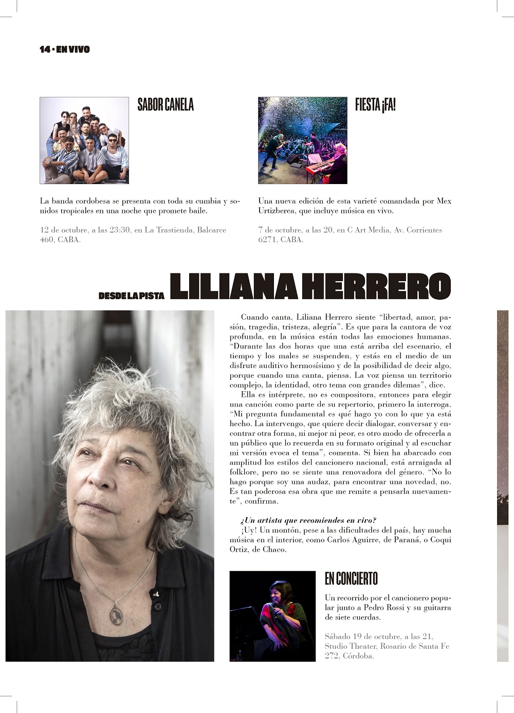 «Cuando canta, Liliana Herrero siente “libertad, amor, pasión, tragedia, tristeza, alegría”. Es que para la cantora de voz profunda, en la música están todas las emociones humanas. “Durante las dos horas que una está arriba del escenario, el tiempo y los males se suspenden, y estás en el medio de un disfrute auditivo hermosísimo y de la posibilidad de decir algo, porque cuando una canta, piensa. La voz piensa un territorio complejo, la identidad, otro tema con grandes dilemas”, dice.