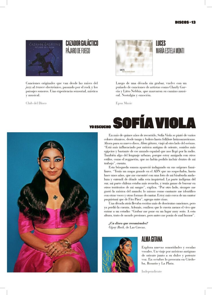 En más de quince años de recorrido, Sofía Viola se pintó de varios colores rítmicos, desde tango y bolero hasta folklore latinoamericano. Ahora para su nuevo disco, Alma gitana, viajó al otro lado del océano. “Está más influenciado por música antigua de oriente, sonidos más egipcios y bastante de ese mundo español que nos llegó por la radio. También algo del lenguaje urbano, porque estoy amigada con otros estilos, como el reggaetón, que no había podido incluir dentro de mi trabajo”, cuenta.