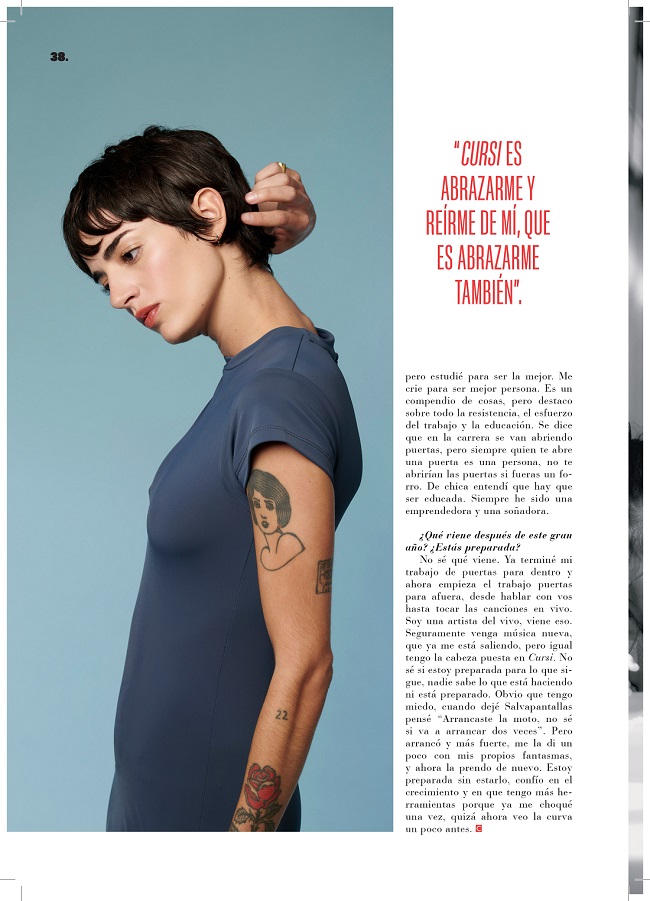No sé qué viene. Ya terminé mi trabajo de puertas para dentro y ahora empieza el trabajo puertas para afuera, desde hablar con vos hasta tocar las canciones en vivo. Soy una artista del vivo, viene eso. Seguramente venga música nueva, que ya me está saliendo, pero igual tengo la cabeza puesta en Cursi. No sé si estoy preparada para lo que sigue, nadie sabe lo que está haciendo ni está preparado. Obvio que tengo miedo, cuando dejé Salvapantallas pensé “Arrancaste la moto, no sé si va a arrancar dos veces”. Pero arrancó y más fuerte, me la di un poco con mis propios fantasmas, y ahora la prendo de nuevo. Estoy preparada sin estarlo, confío en el crecimiento y en que tengo más herramientas porque ya me choqué una vez, quizá ahora veo la curva un poco antes.